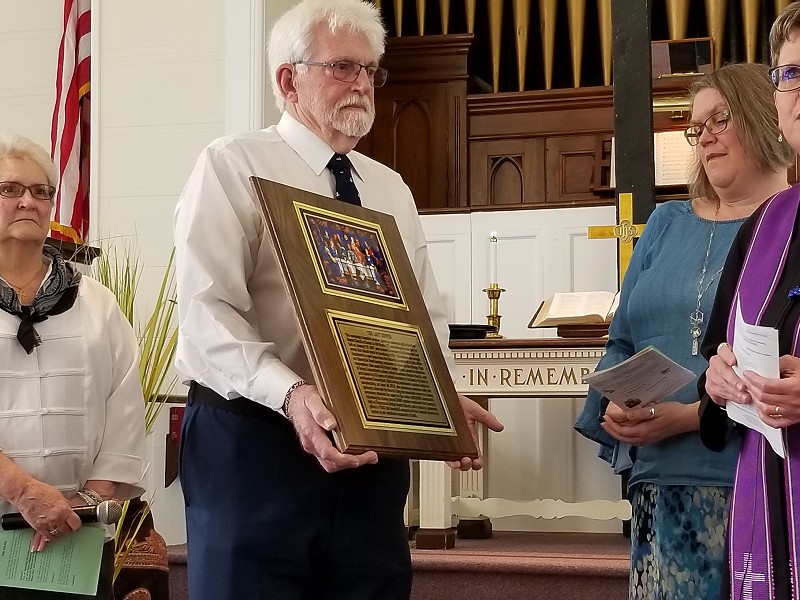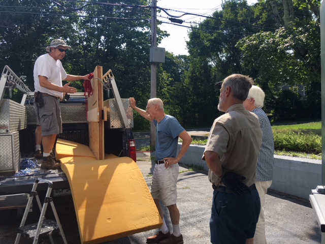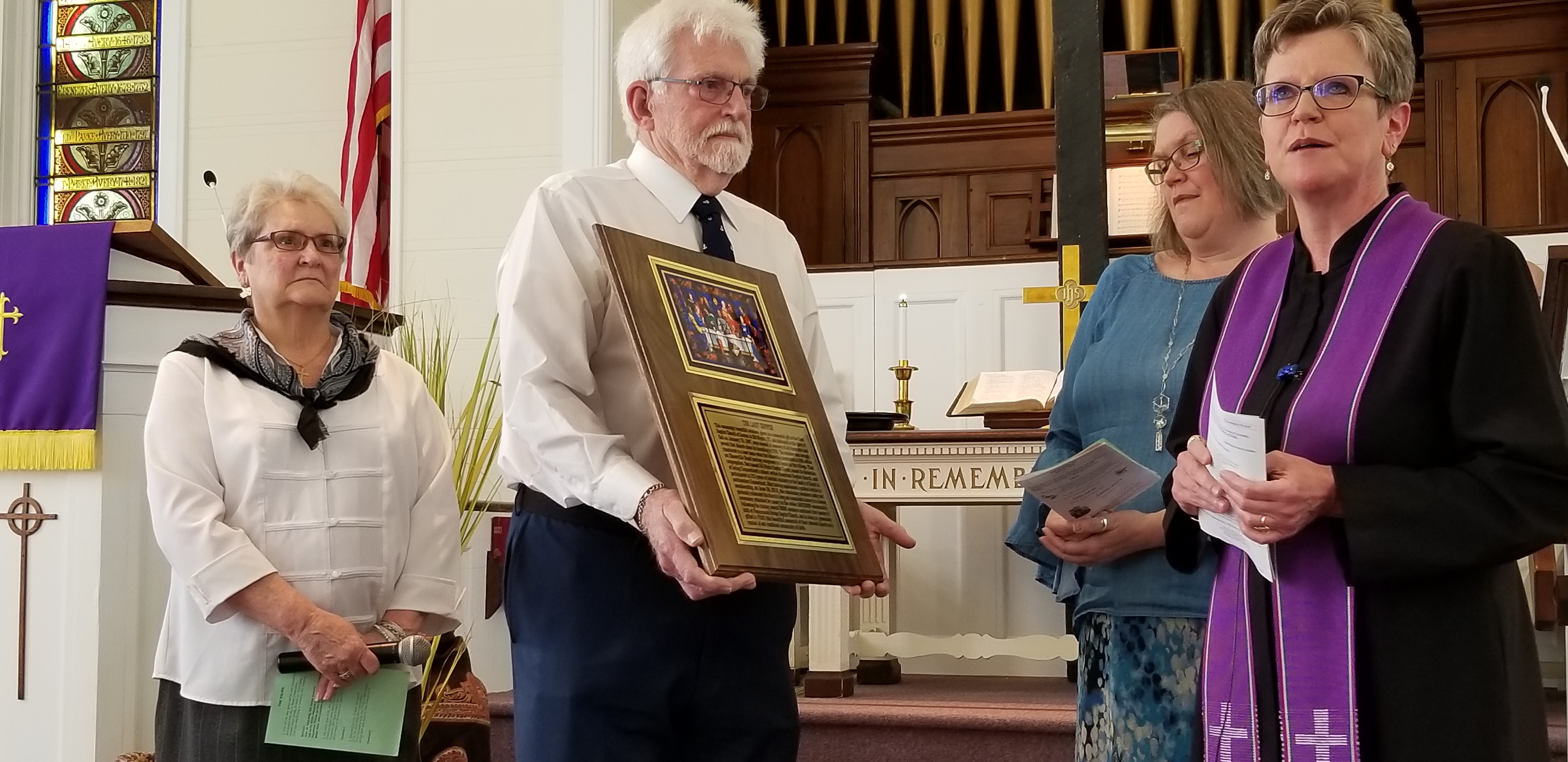 There are so many people to thank for this wonderful gift! First we thank the people from Old Mystic Baptist Church-part of your old church will now live on in our church. We would also like to thank Rick Tourjee, Dick Tourjee, John Rodearmel and Steve Champ (Marilyn Rodearmel’s son) and a friend of Steves for packing and delivering the window. Many thanks goes to patient person who cleaned it-Catherine Hiller. And no less thanks goes to Richard and Rick Tourjee and Ron Land for installing, lighting and framing it! It indeed was a labor of love and we cannot thank you enough! John created a plaque to commemorate the event and presented it to PBBC to hang near the window.